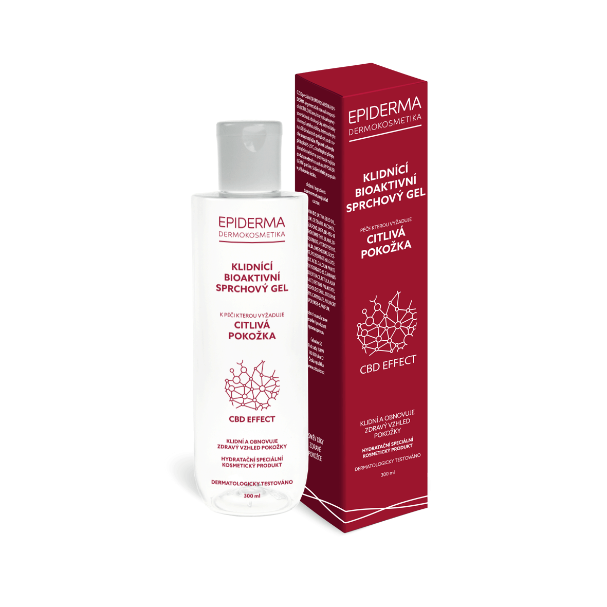 Klidnící bioaktivní CBD sprchový gel Epiderma 300 ml stejně jako ostatní výrobky řady obsahuje generačně novou kompozici konopného cannabidiolu (CBD) a březového výtažku patentovanou jako přírodní paranaturkortikoid Betuldiol.