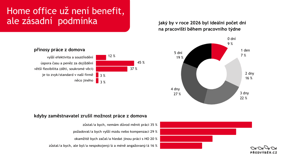 (Praha 27. 12. 2025) ‒ Téměř 37 % z těch zaměstnanců, kteří mají možnost kombinovat home office s prací ve firmě, by při zrušení práce z domova okamžitě změnilo práci nebo by se přestali snažit. Ukázal to reprezentativní průzkum personální společnosti Předvýběr.CZ, pro který data sbírala agentura Talk Online Panel.