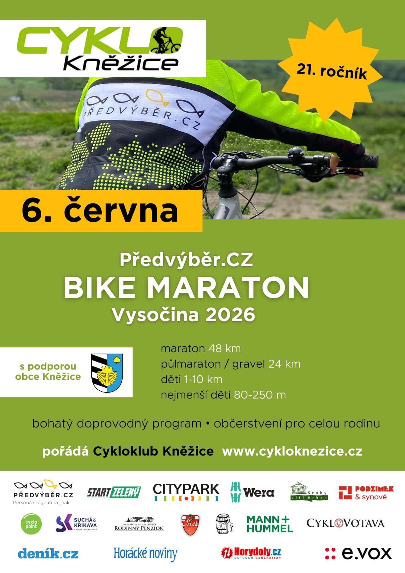 (Kněžice 15. 4. 2026) ‒ Už po jedenadvacáté vyrazí letos v sobotu 6. června od kněžického zámku závodníci cyklistického závodu Předvýběr.CZ Bike Maraton Vysočina 2026.