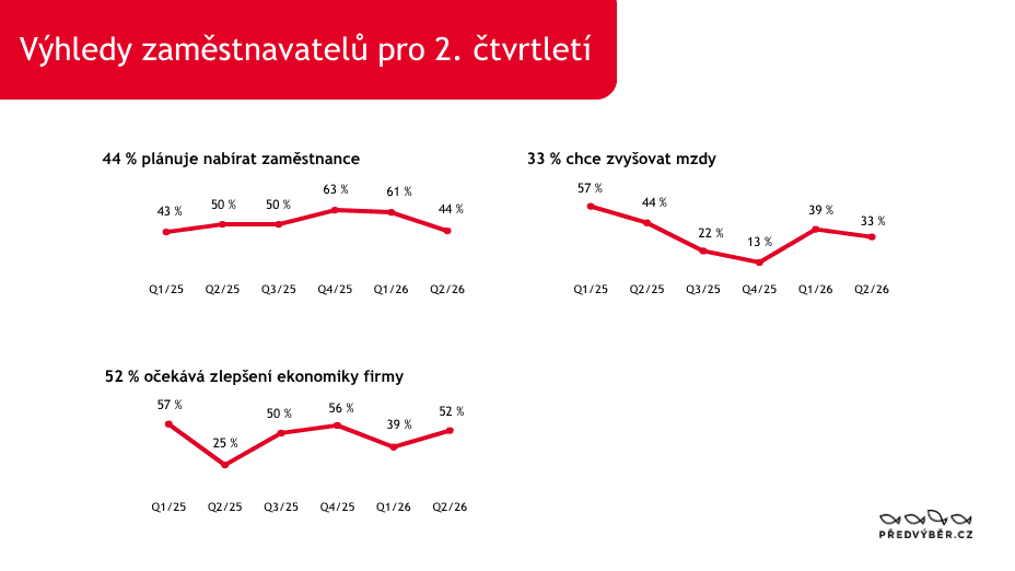 (Praha 31. 3. 2026) ‒ O sedmnáct procentních bodů klesl počet firem, které chtějí ve druhém čtvrtletí nabírat nové zaměstnance. Přesto třetina zaměstnavatelů, podobně jako na začátku roku, bude zvyšovat mzdy. Ukázal to pravidelný čtvrtletní online průzkum personální agentury Předvýběr.CZ mezi stovkou stálých respondentů z řad majitelů, šéfů a personalistů firem.